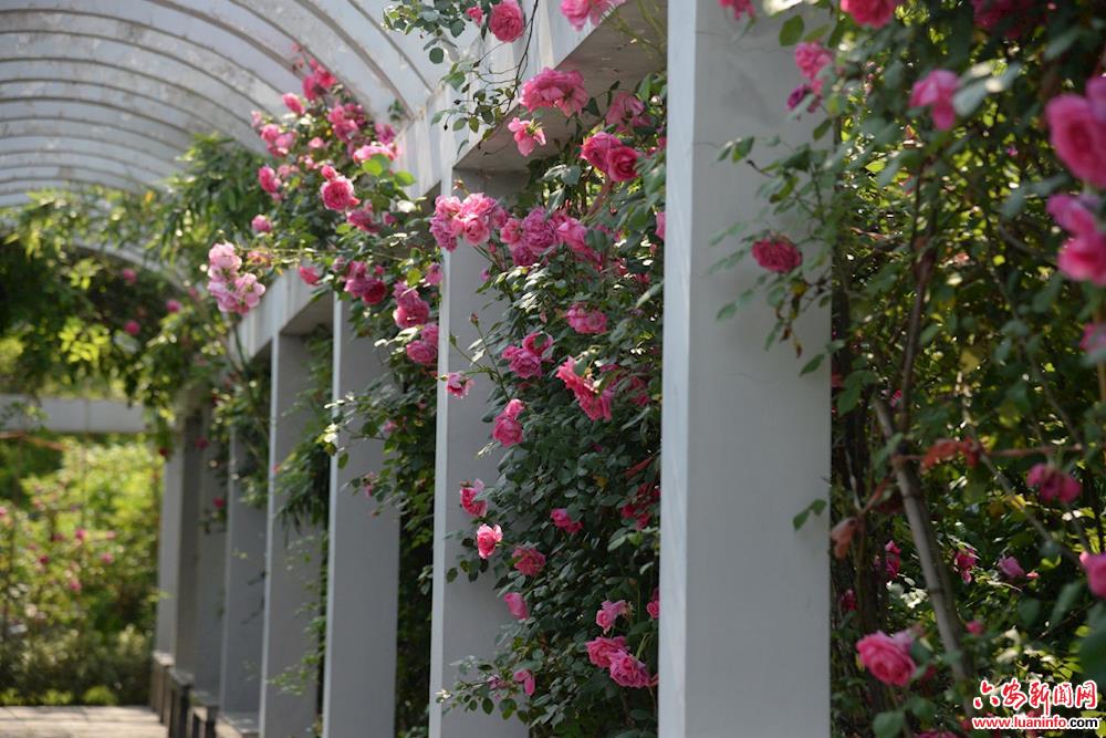 近日,在市区皋城路皖西卫生职业学院里,一位工人正在忙着打理校园里的月季花,大红、粉色等花色的月季花把校园一角装点得姹紫嫣红。随着气温逐渐升高,该校区内月季花廊的月季进入盛花期,成为校园里的一道亮丽风景。( 皖西日报融媒体记者 王丽 摄)