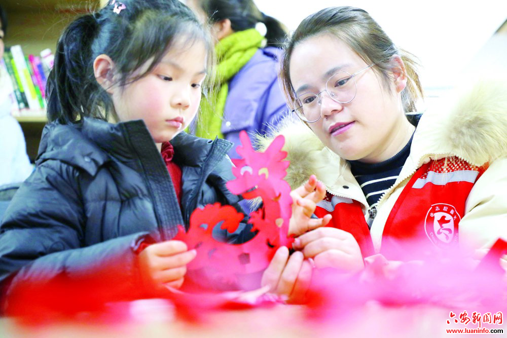 1月23日,在金安区东市街道长安社区,社区志愿者和同学们一起学习剪窗花。考试刚结束,寒托即开班。为丰富学生们的假期文化生活,金安区东市街道长安社区寒假托管服务近日开班,社区志愿者和辖区的大学生为孩子们提供作业辅导、美术、手工、安全教育等课程,本着以学生自愿的原则提供看护服务,帮助家长解决假期“看护难”的问题。(记者