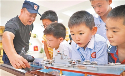 7月25日,安徽省六安市金安区望城街道联合六安市退役军人志愿服务队,走进望城街道正阳社区,开展“强国复兴有我 童心筑梦国防”主题活动,引导孩子们从小增强国防意识,厚植家国情怀。图为志愿者在向小朋友讲解海军舰艇知识。田凯平摄(人民视觉)