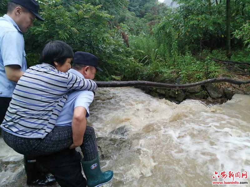 山涧流水湍急,河道水深齐膝,河底乱石嶙峋,年轻人稍有不慎都会被水流冲倒。程楚所长二话不说脱鞋背起了老人,扶着两位同志临时找来的树枝,小心翼翼的往河里走。河底的碎石硌的脚底生疼,背上的重量更是加剧了疼痛。程所长一声不吭,咬牙坚持,稳步前行,护送老人到了安全区域。随后,他不顾脚底的划伤,继续奔赴下一户。