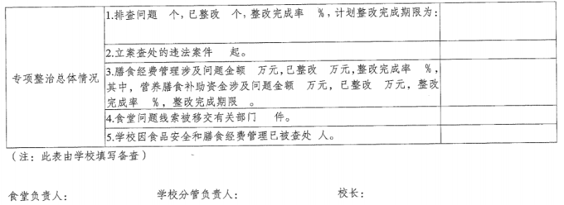 (一)提高思想认识。当前专项整治工作成效与党中央要求、群众期待还有不小差距,各中小学校要进一步提高思想认识,扛起主体责任,以战斗姿态超常规纵深推进专项整治,严格将“校园餐”突出问题作为“专项整治中的专项”,把有效解决“校园餐”等教育领域突出问题打造成集中整治标志性成果,下大气力推动专项整治工作走深走实,见实见效。