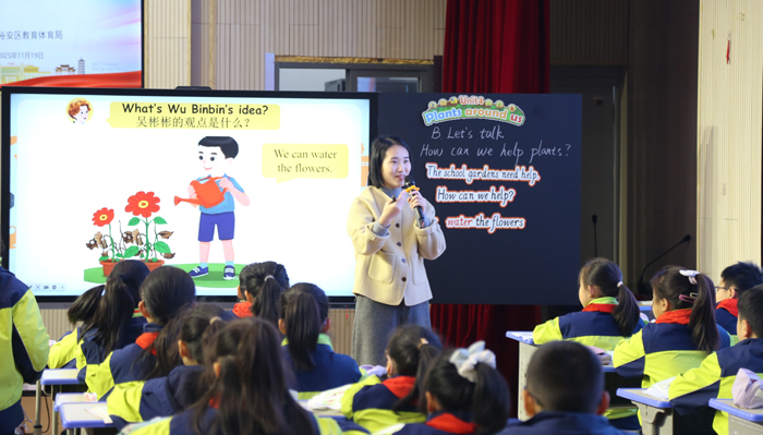 张丹丹老师执教的对话课,巧妙联结学生生活实际,从班级植物角、齐园等场景切入创设教学情境,引发学生主动思考与表达欲望,引导学生自信开口、互动交流,课堂氛围生动活泼。紧接着,陈慧玲老师展示的词汇课亮点纷呈,她不仅灵活运用图片、歌谣、游戏等多元教学手段,将词汇学习融入具体语境,更以丰富的课堂评价用语精准赋能,及时肯定学生的每一次尝试与进步,充分调动学生的参与热情,让学生在轻松愉悦的氛围中高效掌握核心语言知识。两节展示课深度践行“学用结合”的教学思想,为现场观摩教师提供了可借鉴、可操作的实践范例。