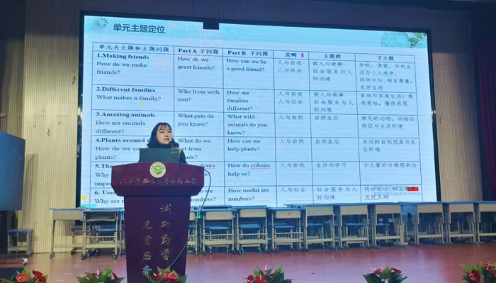 课堂观摩结束后,研讨活动向更深层次推进。裕安区小学英语兼职教研员汪红老师带来《三年级上册 U4单元教学的整体构建与实践》专题分享,她立足单元主题意义,系统梳理各板块内在逻辑与教学目标,详细阐述了如何以 “身边的植物” 为主线,开展整体性、情境化教学设计的思路与方法。