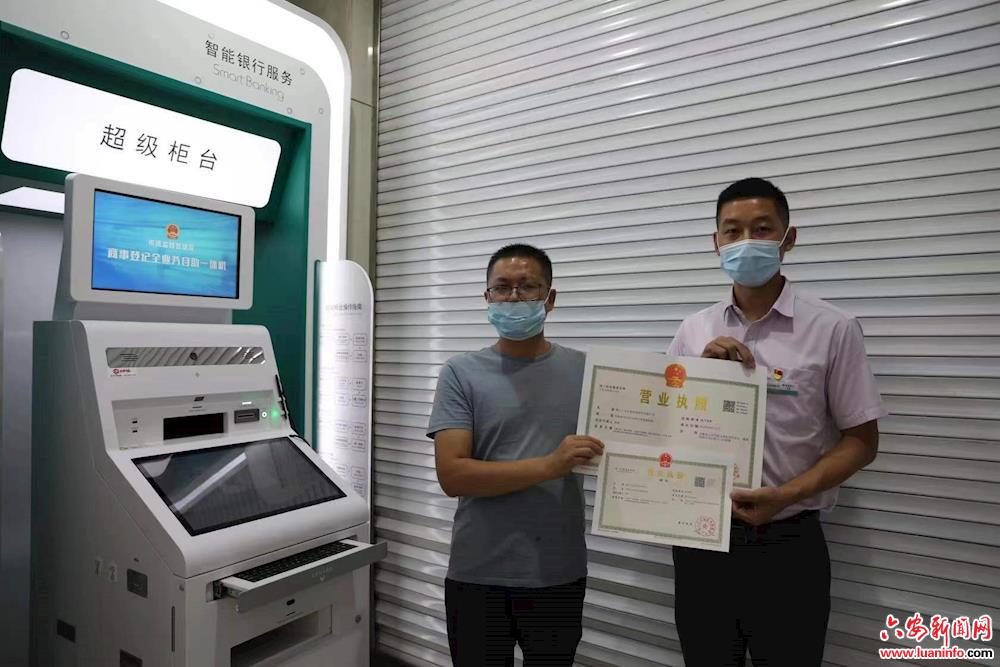 8月23日下午,六安市霍山县衡山镇的段先生来到中国农业银行霍山县支行营业部,在银行工作人员的指导下,通过商事登记全业务自助一体机,不用半个小时,就完成了从登记信息填报、数据采集、实名认证、自动审批到执照打印等一系列手续,领取到了公司营业执照,真正实现了“自助申报、智能审批、当场发照”。