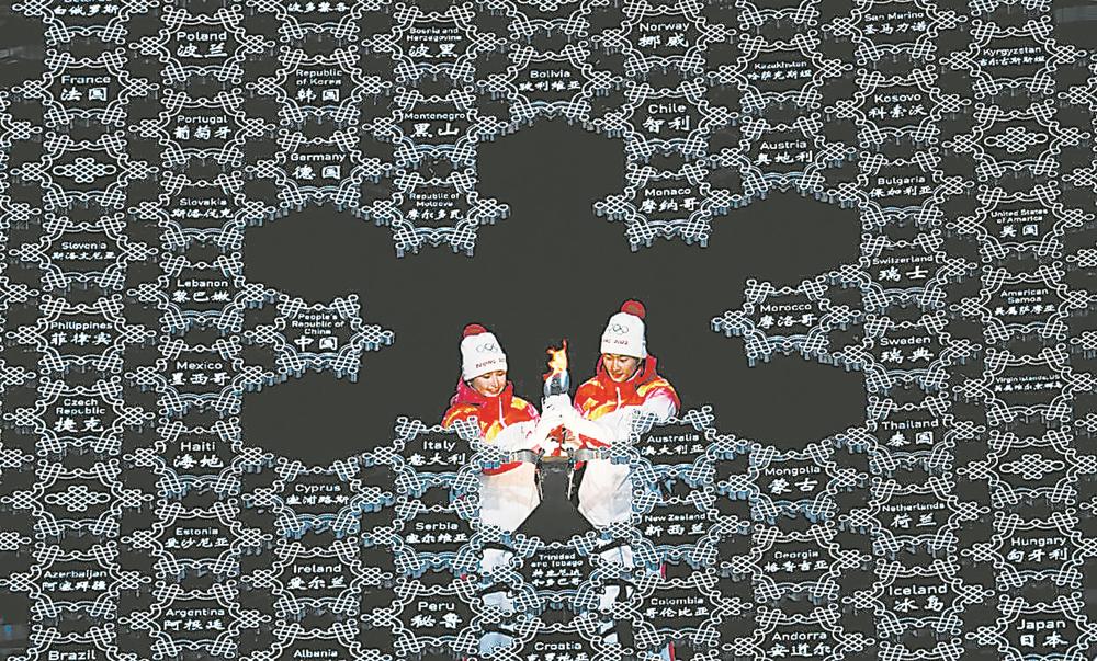 ▲ 2月4日晚,第二十四届冬季奥林匹克运动会开幕式在北京国家体育场举行。这是最后一棒火炬手迪妮格尔·衣拉木江(左)和赵嘉文将火炬嵌入“大雪花”中央。 新华社记者 李尕 摄