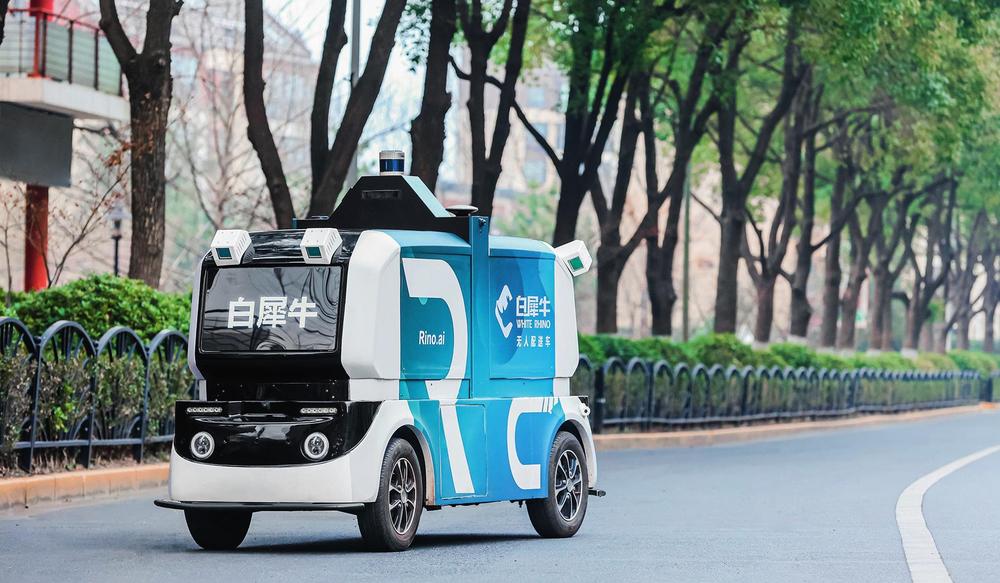 白犀牛智达(合肥)科技有限公司的无人驾驶配送车行驶在合肥街头为居民配送网购商品(2022 年 2 月 28 日摄) 白犀牛智达(合肥)科技有限公司供图
