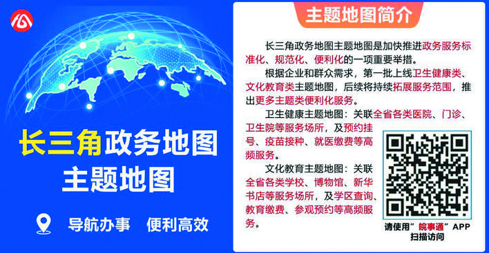 据了解,卫生健康类主题地图既有空间位置、又有服务事项,既能查询、又能办事,群众可以快速查询周边各级医疗服务场所相关信息,线上线下导航办理各类高频服务。目前蚌埠、芜湖、马鞍山、淮南、黄山、阜阳、宿州等7个地市已上线试点运行,后期将在全省推广应用。