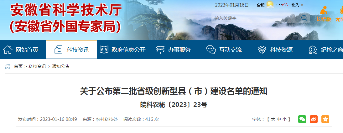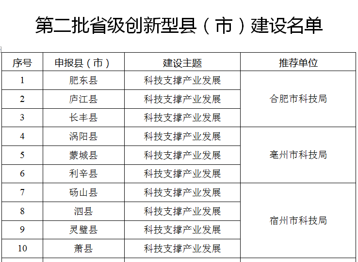 1月16日,安徽省科技厅网发布关于公布第二批省级创新型县(市)建设名单的通知。