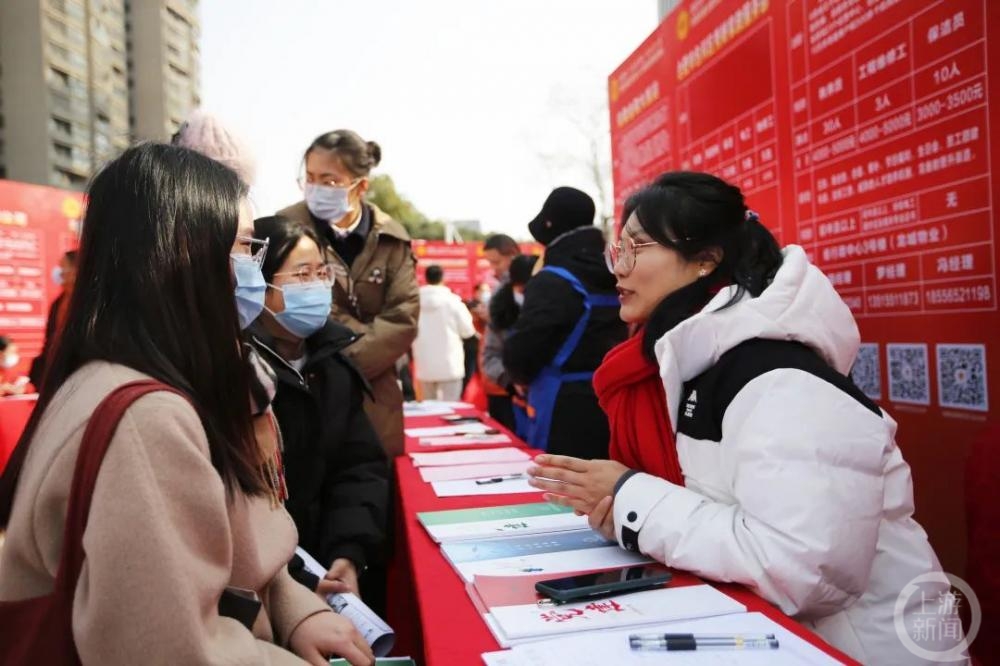 ▲合肥市“工会送岗位 乐业在江淮”就业援助招聘会上,应聘者正在向工作人员咨询相关事项。图片来源:合肥工会