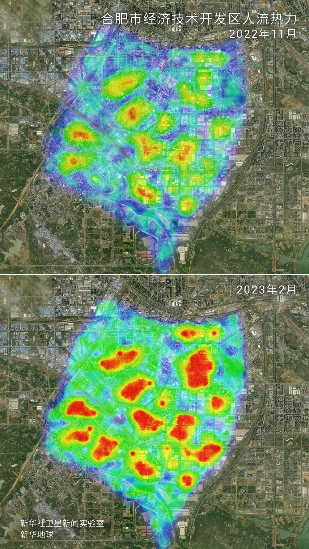 这是通过手机信令大数据制作的人流热力图。图中有色区域代表剔除常住人口后的手机信号,信号密度越大,颜色越深。与2022年11月相比,2023年2月,国家级合肥经济技术开发区呈现出更大范围、更密集的人流热力,反映出随着企业全部开工带来大幅增长的人流量。