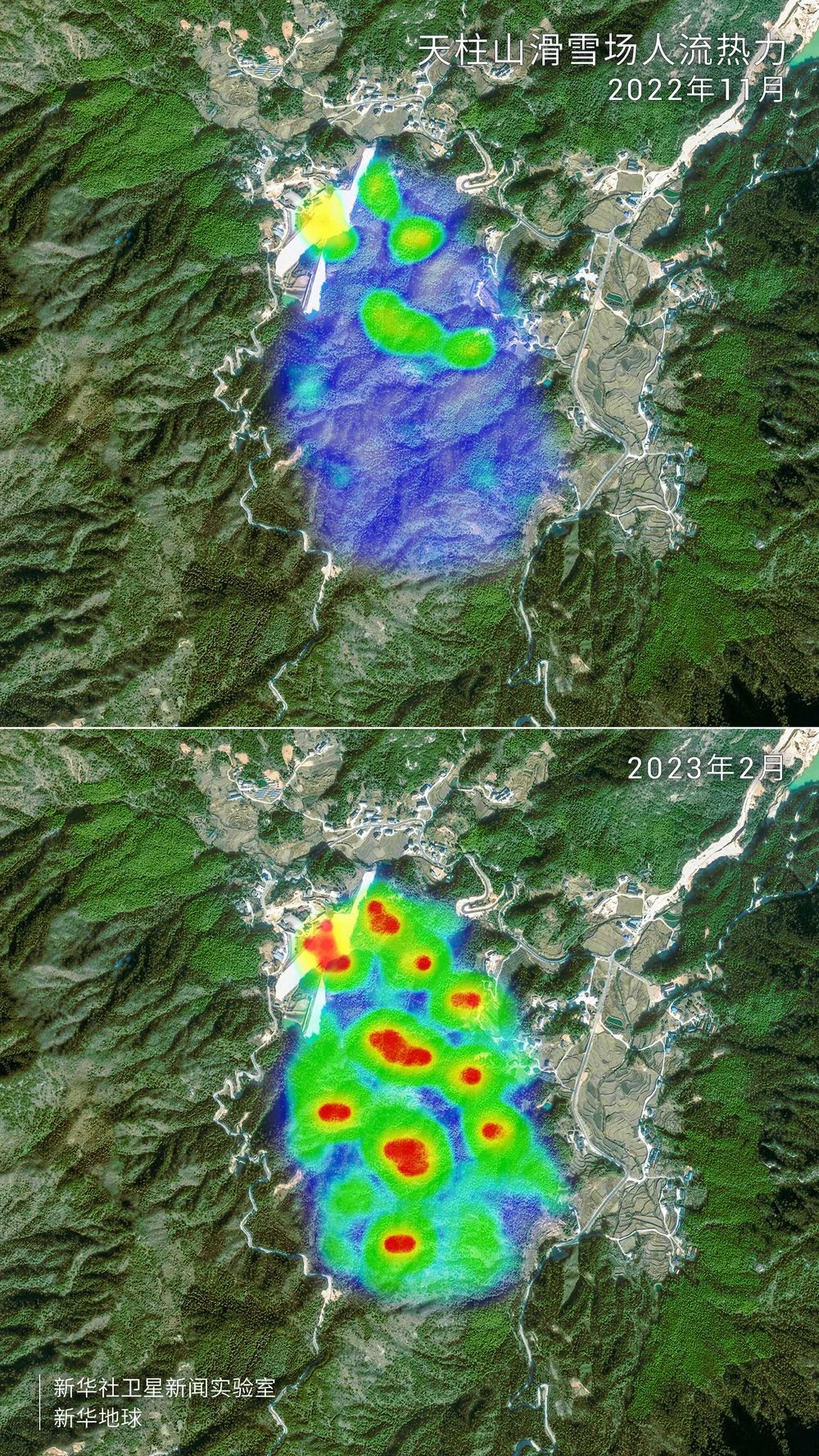 “冰雪经济”南下,随着新春而来的新消费场景,开年形势同样喜人。在安徽省潜山市天柱山滑雪场,人流热力图的对比清晰地反映出滑雪场游客数量的增加。