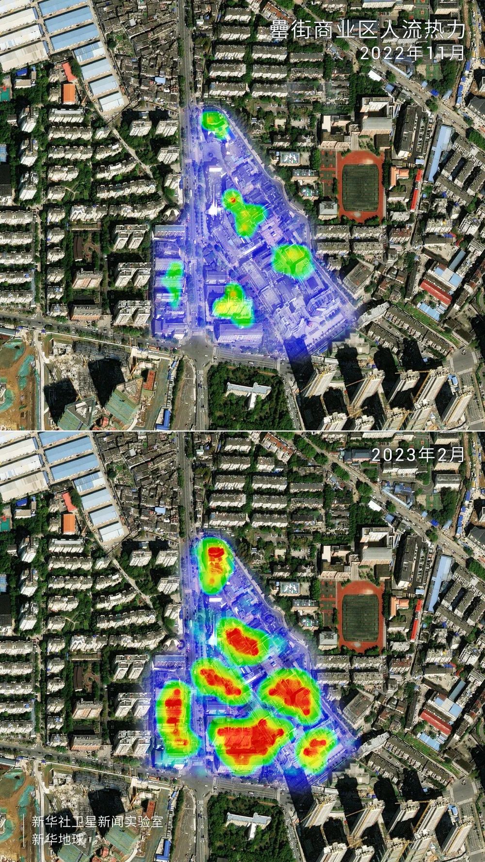 在安徽省特色美食文化街区——合肥罍街,通过2022年11月和2023年2月的两张人流热力图对比,可以清晰看出客流量的明显增加。