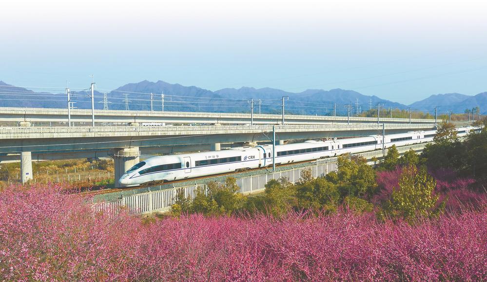 日前,绩溪县华阳镇,一趟趟高铁列车穿梭在花海之中。 本报通讯员 汪在毅 摄