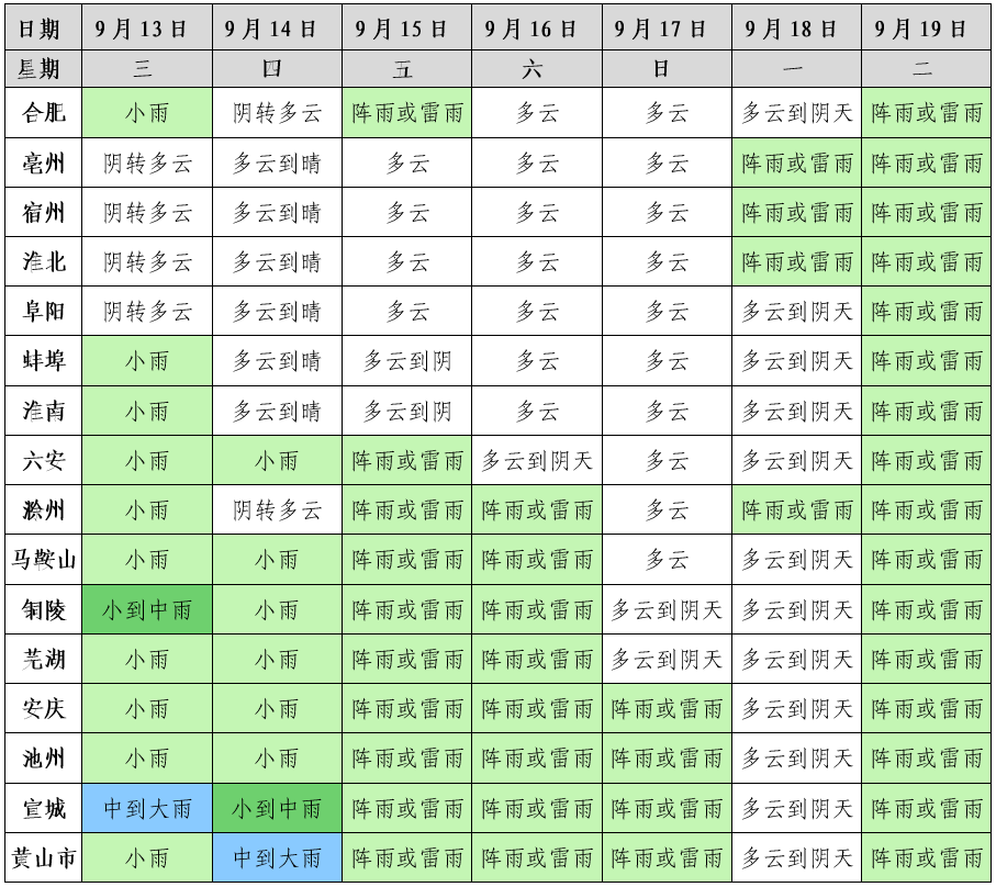 9月13日, 安徽省气象台公众号发布未来一周天气预报。