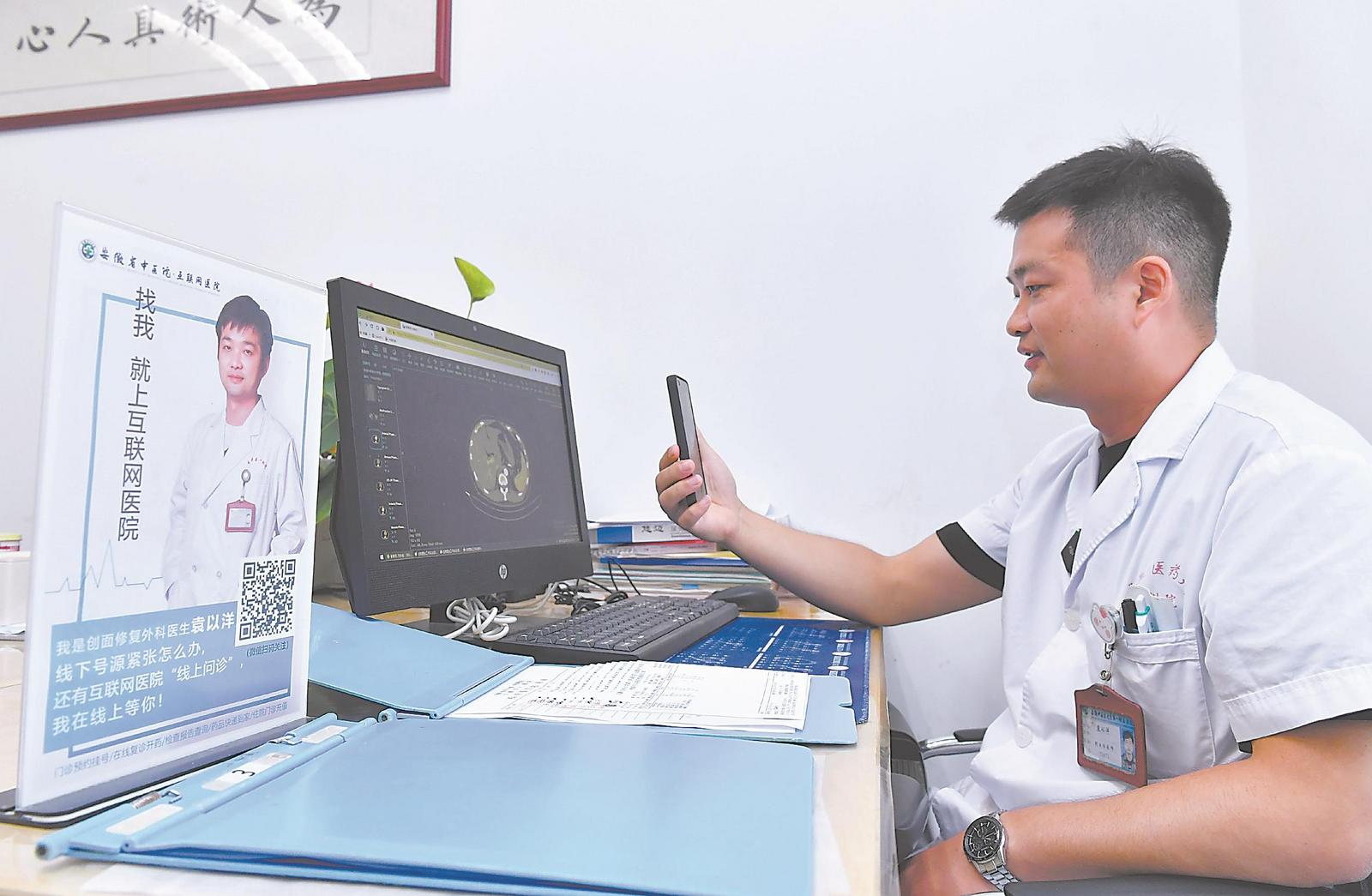 9月12日,在安徽中医药大学第一附属医院,急诊外科医生袁以洋正通过互联网医院手机端在线问诊蚌埠的患者刘先生。“一年前,他入院治疗,出院后定期通过互联网医院在线复诊。我们根据需要调整中药配方,并将药品代煎后由快递发送,隔天他就能收到,免去了他的奔波之苦。”袁以洋说。