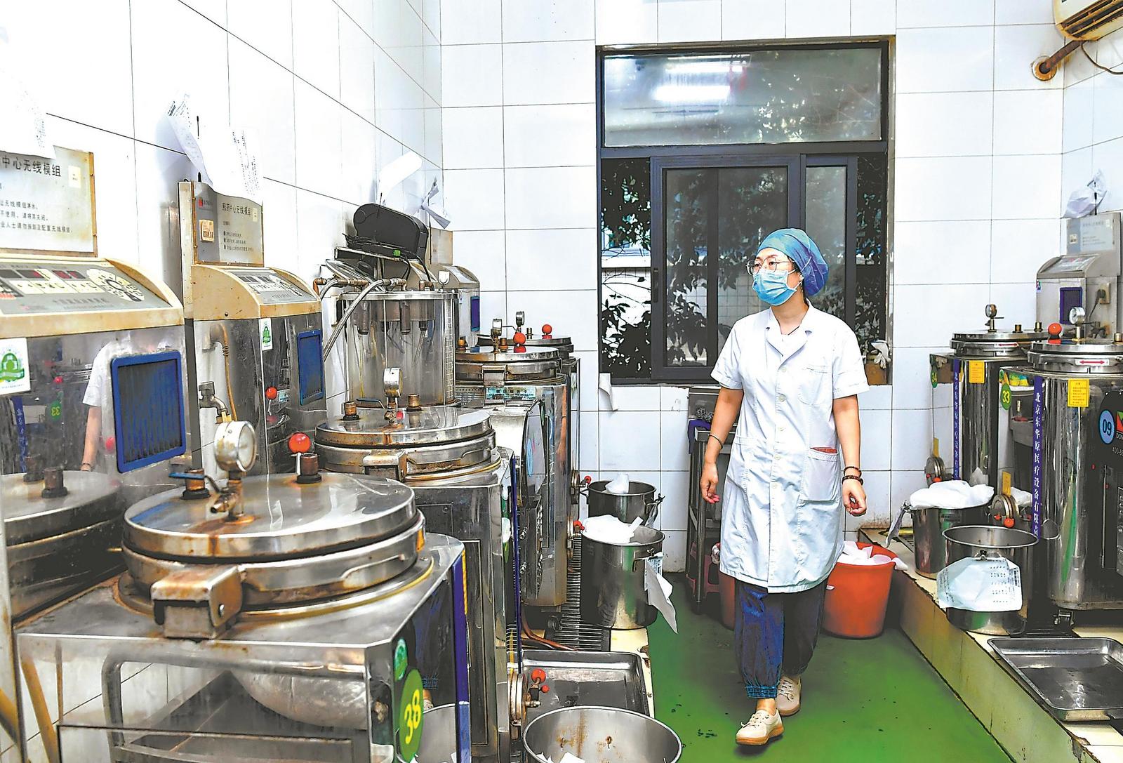在智慧煎药中心,工作人员查看煎药机。