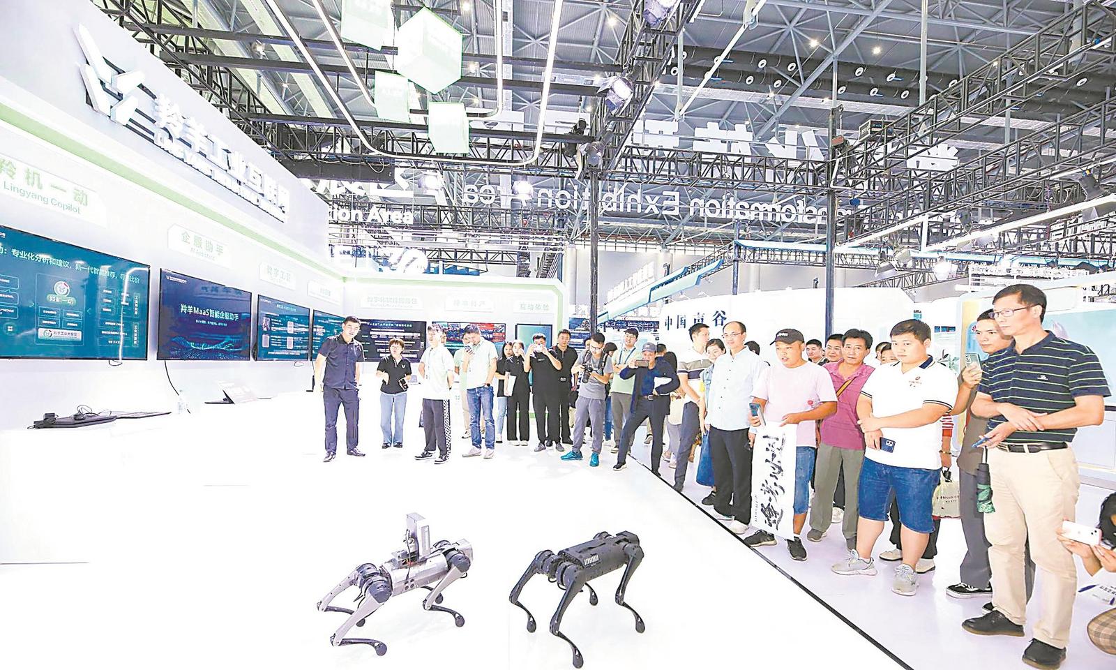 在2023世界制造业大会数字化转型展区,智能四足机器狗引来观众围观。 (图片均由科大讯飞提供)