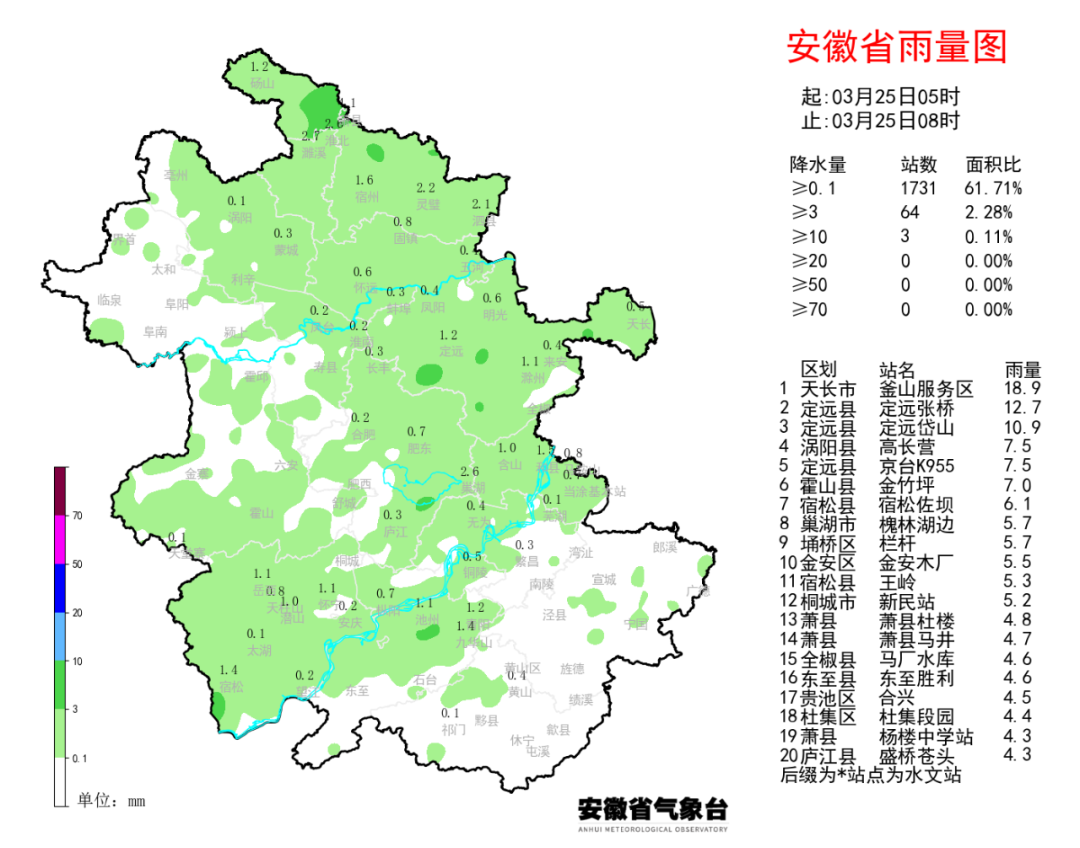 25日05时-08时,沿江江北大部分地区有降水。全省共有3个站降水量超过10毫米,最大天长釜山服务区18.9毫米。全省共有3个站出现8级以上阵风,1个站出现9级以上阵风,最大黄山21.1m/s (9级)。