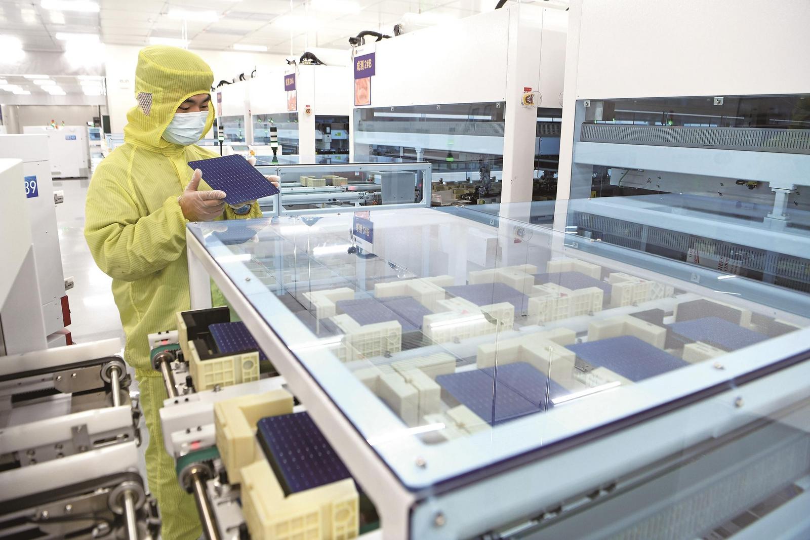 日前,在凤台县中环低碳(安徽)新能源光伏科技有限公司内,员工正在检查N型TOPCon电池产品。特约摄影 陈 彬 记者 柏 松 摄