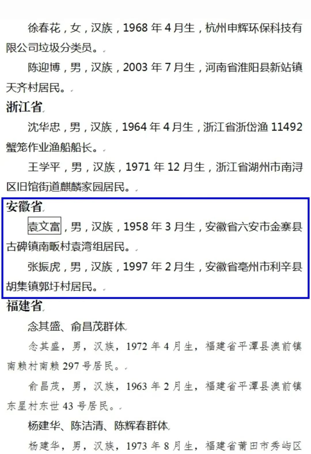 4月2日,中央政法委在京发布2024年第一季度见义勇为勇士榜。根据网络关注度和各地各单位选树及综合评审,共有55位勇士光荣上榜,其中安徽的袁文富、张振虎上榜。