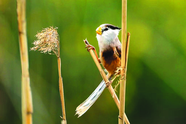 由于它的食物来源单一,极度依赖芦苇,所以它的数量不多,是国家二级重点保护动物,又被《世界自然保护联盟濒危物种红色名录》(IUCN)列为近危(NT)物种。“震旦”是中国的古称,以此给一种小鸟命名,不仅富有中国特色,更彰显了神秘和古老。