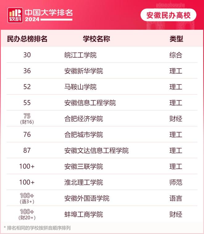 除此之外,我省高校进入主榜全国400强之列的有:安徽师范大学(第139名)、安徽农业大学(第153名)、安徽工业大学(第185名)、安徽理工大学(第192名)、安徽工程大学(第260名)、安徽建筑大学(第270名)、合肥大学(第287名)、淮北师范大学(第321名)、安庆师范大学(第334名)、安徽科技学院(第358名)、合肥师范学院(第367名)、阜阳师范大学(第398名)。