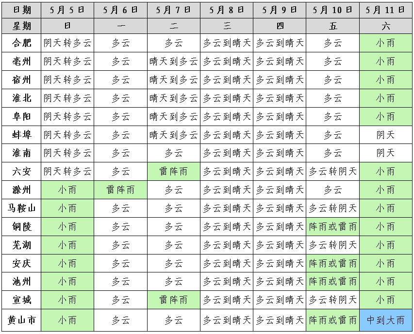 11日:全省阴天。淮北部分地区和淮河以南有小雨,其中沿江江南部分地区有中到大雨。