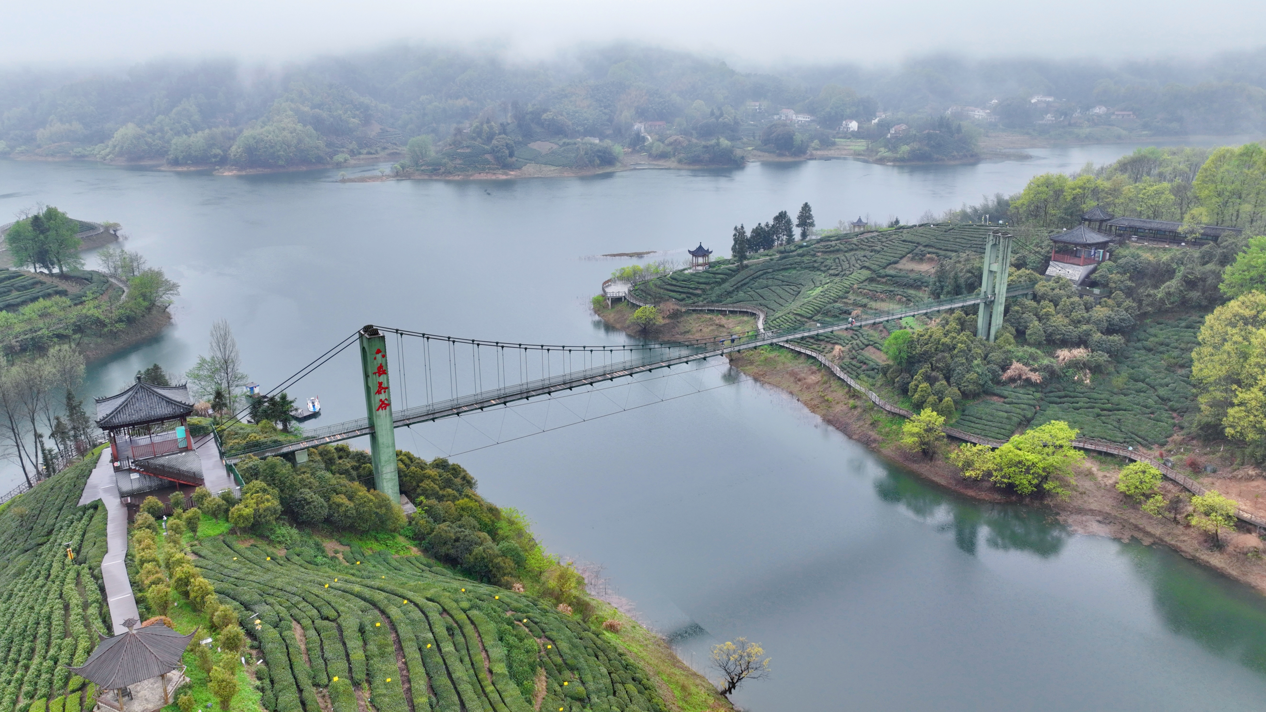 名优绿茶产区,往往也是风光胜地。一场阵雨过后,六安西茶谷主题公园里云雾缭绕,山、水、茶交相辉映,宛如仙境。