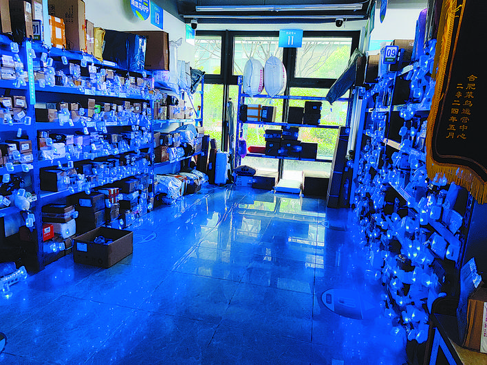 除了方便消费者找件,菜鸟驿站合肥城市负责人吕志强介绍,灯条的使用也让入库效率变高。“之前用小票纸入库的模式,不仅浪费纸张、容易出错,速度还很慢,现在有了灯条会更加环保,工作人员在操作上也会更加便利。”