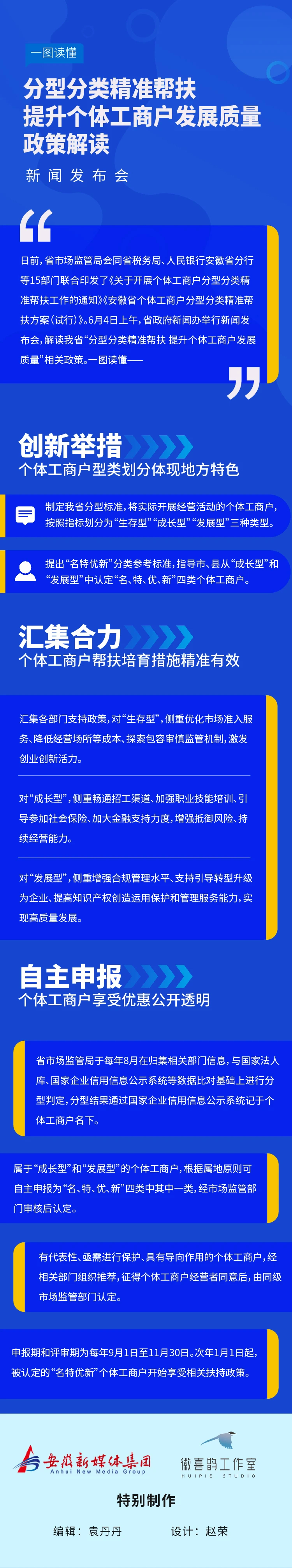 中安在线、中安新闻客户端讯 6月4日,记者从安徽省政府新闻办召开的新闻发布会上获悉,日前,省市场监管局会同省税务局、人民银行安徽省分行等15部门联合印发了《关于开展个体工商户分型分类精准帮扶工作的通知》《安徽省个体工商户分型分类精准帮扶方案(试行)》,以分型提供差异化帮扶,以分类发挥示范带动作用,加强政策精准供给和梯次帮扶培育,不断提升个体工商户稳定经营能力和总体发展质量。