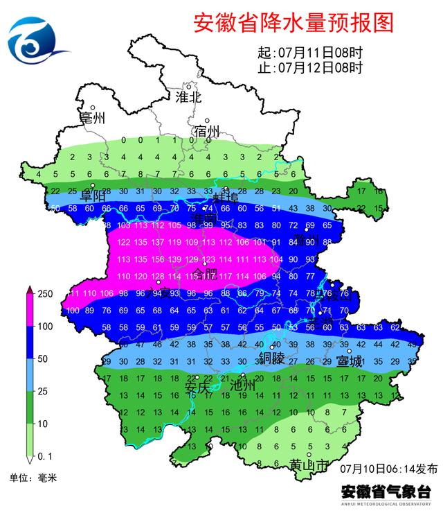 预计7月10日至12日,安徽主雨区的变化不大,位于江淮之间和沿江东部地区,大部分地区有大雨到暴雨,其中六安、合肥、滁州和马鞍山等地部分地区大暴雨。强降水期间伴有短时强降水、雷电和雷暴大风等强对流天气。
