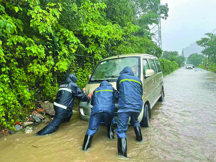 7月11日,庐阳区电厂路与防汛路交口,庐阳城管执法队员将被困车辆推行至安全区域。 张琪琪 摄