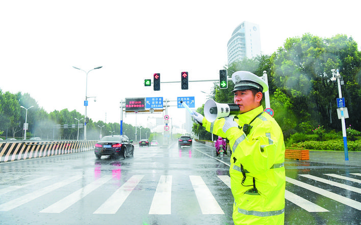 7月11日,交警公巡一大队安排警力疏导南二环与潜山路交口早高峰交通,全力护航市民出行。 陈三虎 摄