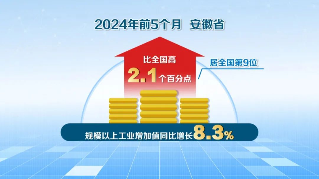打好“改革牌”,统筹推进新兴产业、未来产业、传统产业高质量发展,加快形成新质生产力。2023年,安徽汽车产量、显示面板出货量跃居全国第2位,光伏制造业营收规模居全国第3位;全省国家级高新技术企业达1.95万家,科技型中小企业超2.7万家;全省规模以上工业企业营业收入突破5万亿元,居全国第7位、中西部第1位。今年前5个月,安徽省规模以上工业增加值同比增长8.3%、比全国高2.1个百分点、居全国第9位。