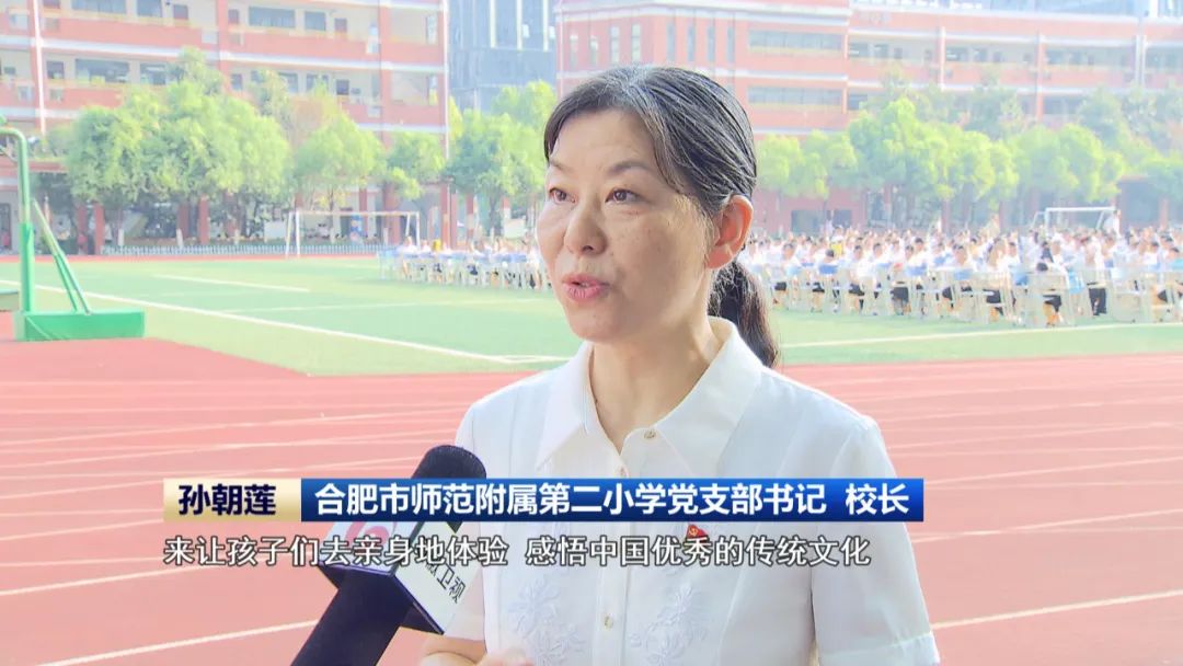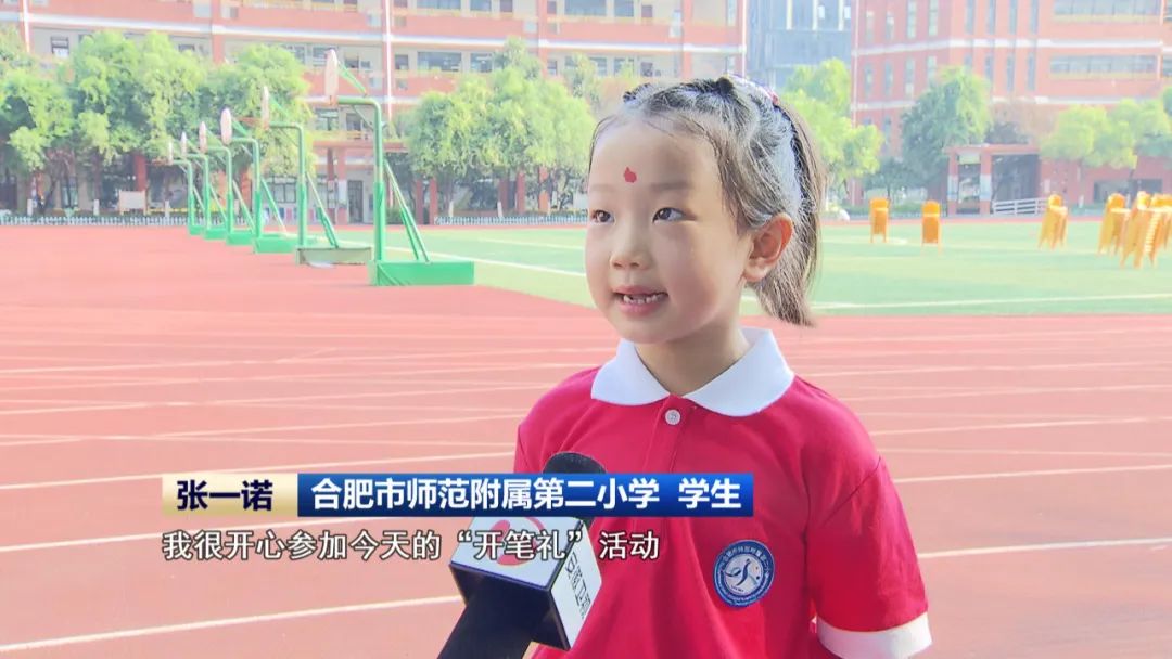我现在是在合肥市师范附小二小,现在是早上的7点20分,在我身后,800多名新生和家长们正在操场上进行秋季开学典礼仪式,在老师的指点下,孩子们正衣冠、拜孔子、点朱砂,举行了庄重的开笔启蒙礼。