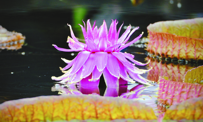 王莲的花期一般在8月至9月,仅有三天,可它的花朵却极为特别。“一般都是晚上开始开放,第一天的花朵为白色,伴有香气,直径约30厘米;第二天它的花朵变为粉红色;第三天花朵为紫红色,然后凋谢沉入水中。这朵花的一生就此完结。”