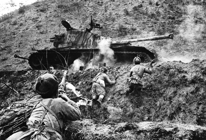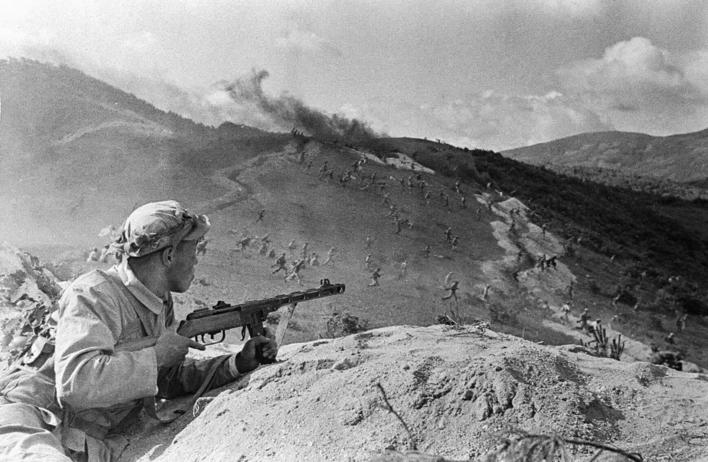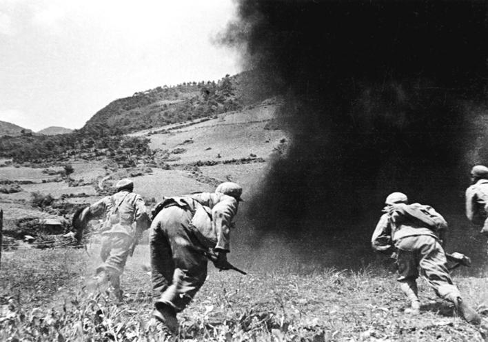 还有一张照片中,一排军人屈膝、提枪,俯身冲下山坡。前方的公路腾起好几股烟雾,两三辆军用卡车陷在雾里。这是1951年5月,中国人民志愿军第九兵团第27军某连将南朝鲜李承晚的首都师部队截击在朝鲜金刚山地区。