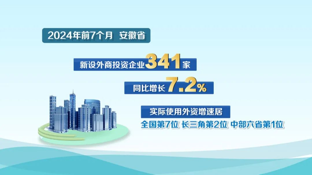 今年前7个月,安徽新设外商投资企业341家,同比增长7.2%;全省实际使用外资增速居全国第7位、长三角第2位、中部六省第1位。