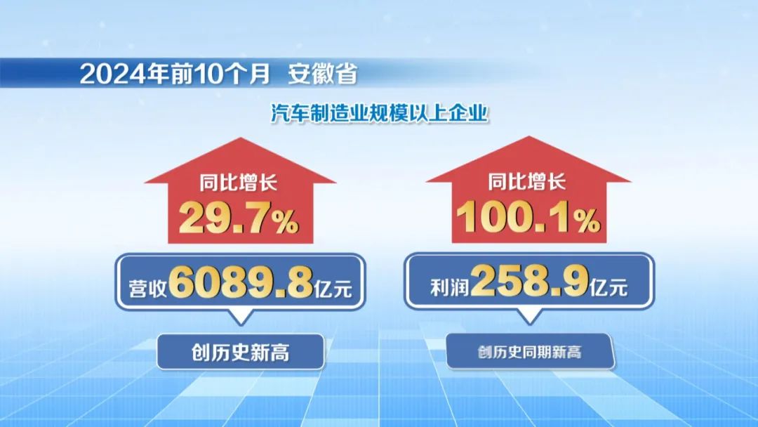 新动能助推产业发展站上新台阶。今年前10个月,安徽汽车产量达282.2万辆、同比增长45.1%,其中新能源汽车129.8万辆,同比增长87.1%,双双创下历史新高,居全国第2位;汽车制造业规模以上企业实现营收6089.8亿元、同比增长29.7%、创历史新高,利润258.9亿元,同比增长100.1%、创历史同期新高。