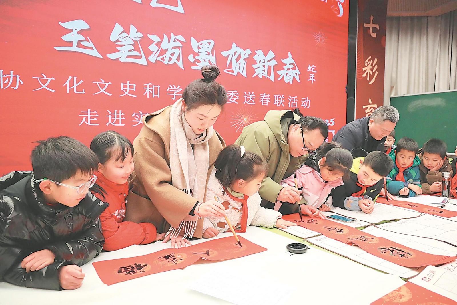 日前,滁州市南谯区政协文史委组织的书法家在市实验小学为广大师生写春联、送福字,把浓浓的新春祝福送给广大师生。通讯员 董超 摄