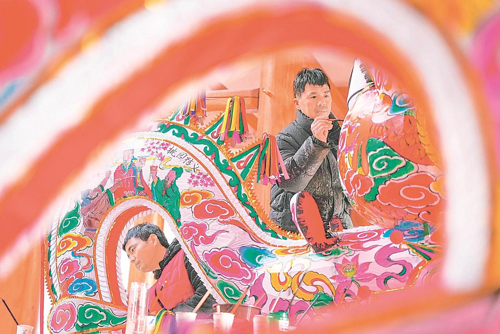 日前,在芜湖市繁昌区繁阳镇红花山村,村民们正为即将到来的春节忙碌准备。传统龙灯制作已进入关键阶段,师傅们在精心绘制龙灯。通讯员 邢朝明 摄