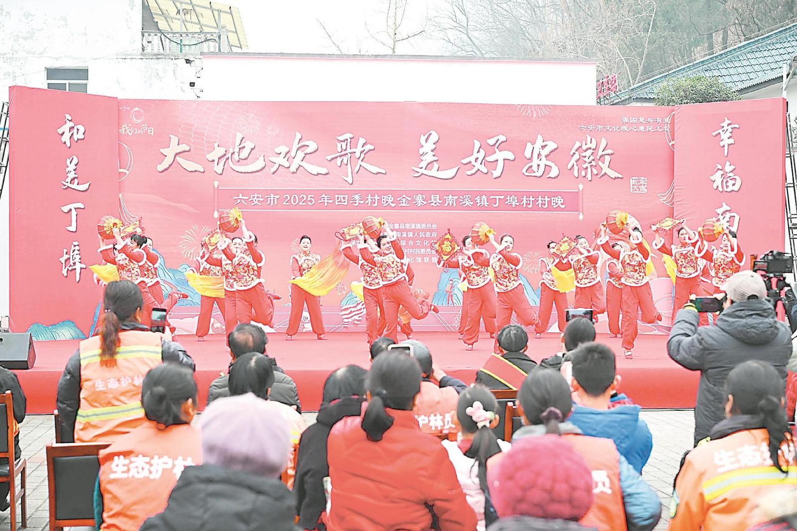 1月23日,在六安市金寨县南溪镇丁埠村新时代文明实践站,村民自编、自导、自演的“村晚”正在进行演出。记者 张大岗 摄