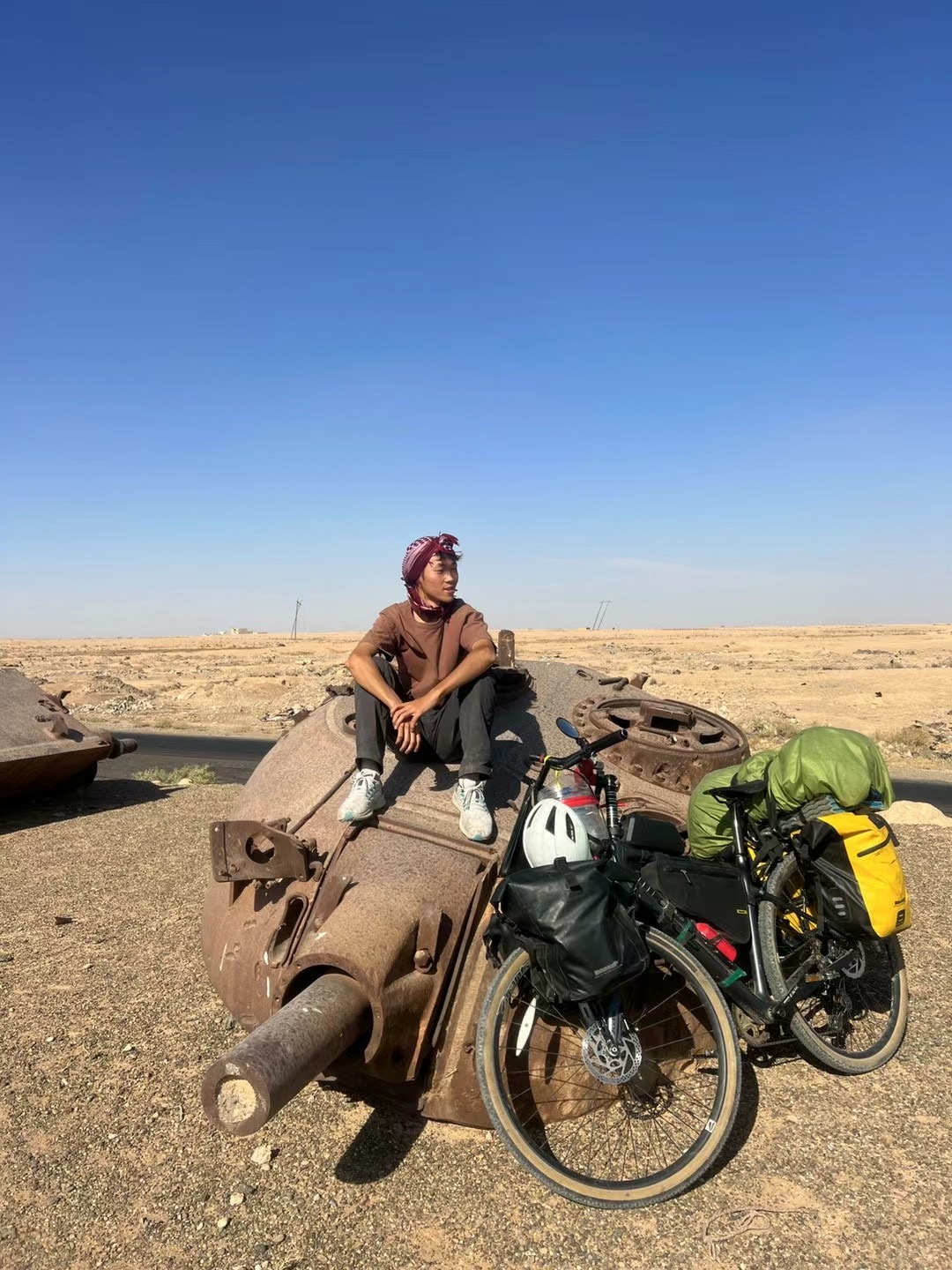 2023年3月11日,马小博带着平时兼职的积蓄,以及父母的“赞助”,从亳州出发,一路骑行到乌鲁木齐,从这里进入哈萨克斯坦。“我的英语不太好,当地的消费又比较高,所以在哈萨克斯坦只停留了15天左右。”随后,马小博又带着自行车一起搭车穿越哈萨克斯坦的无人区,来到了乌兹别克斯坦,经阿塞拜疆、阿联酋,最终到达非洲的埃及。