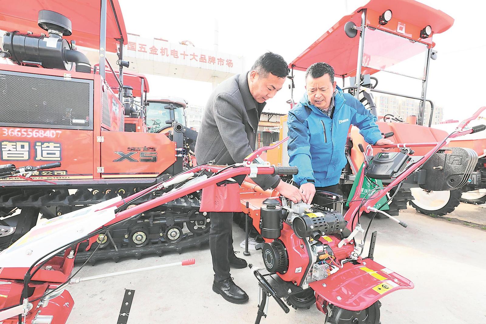2月6日,在安庆市宜秀区农机销售市场,农民正在选购农机设备。通讯员 江胜 摄