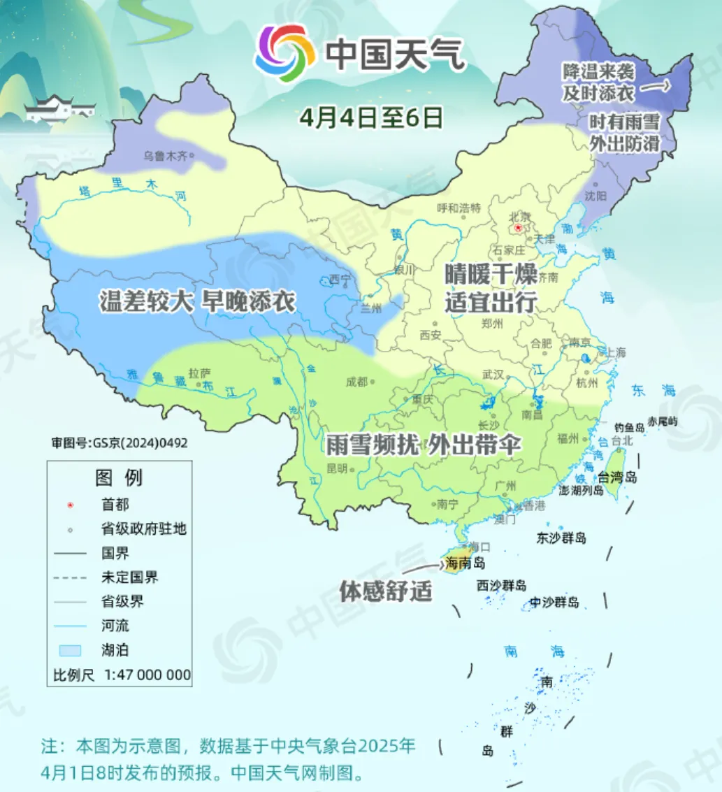 从@中国天气 推出的2025全国清明假期天气地图来看,4月4日至6日,北方大部地区晴朗天气居多,随着气温逐渐回升,白天暖意明显,适宜出行,但多地昼夜温差较大,早晚出行需添衣保暖。