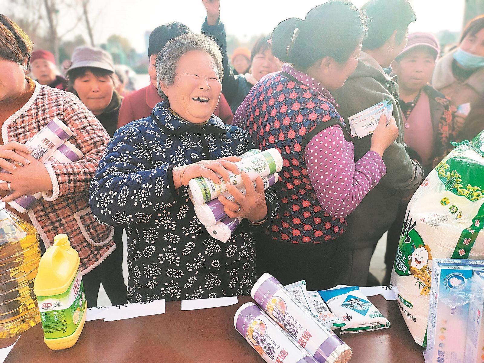 蚌埠市怀远县陈集镇瓦四村开展积分集中兑换活动,村民在活动现场用积分兑换米面等生活物品。(资料图片)蚌埠市委社会工作部供图