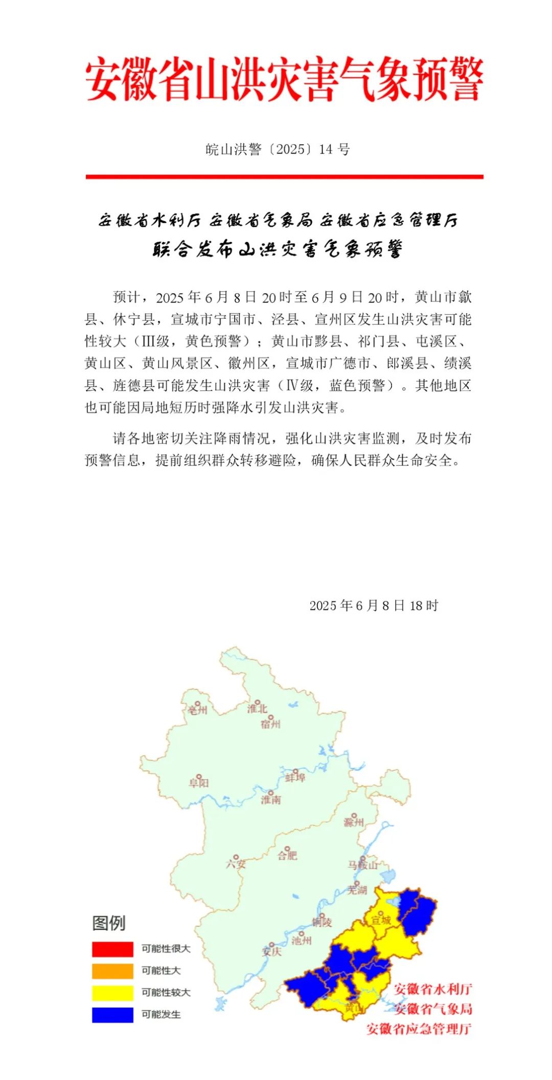 预计,2025年6月8日20时至6月9日20时,黄山市歙县、休宁县,宣城市宁国市、泾县、宣州区发生山洪灾害可能性较大(Ⅲ级,黄色预警);黄山市黟县、祁门县、屯溪区、黄山区、黄山风景区、徽州区,宣城市广德市、郎溪县、绩溪县、旌德县可能发生山洪灾害(Ⅳ级,蓝色预警)。其他地区也可能因局地短历时强降水引发山洪灾害。