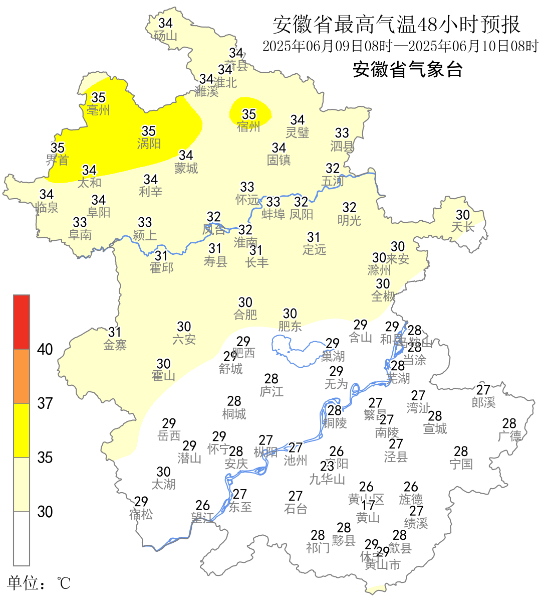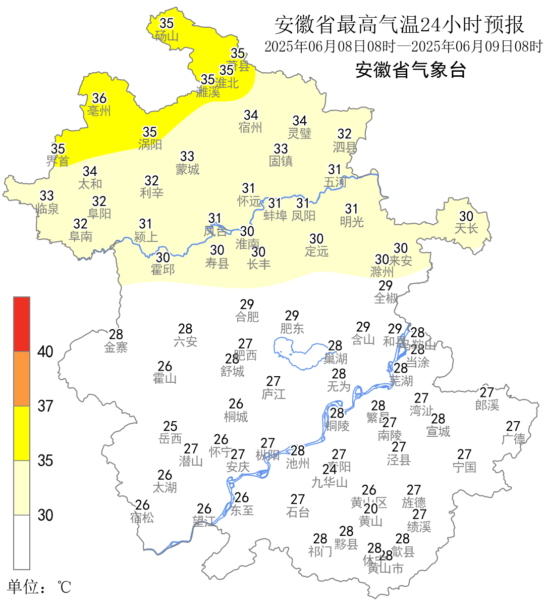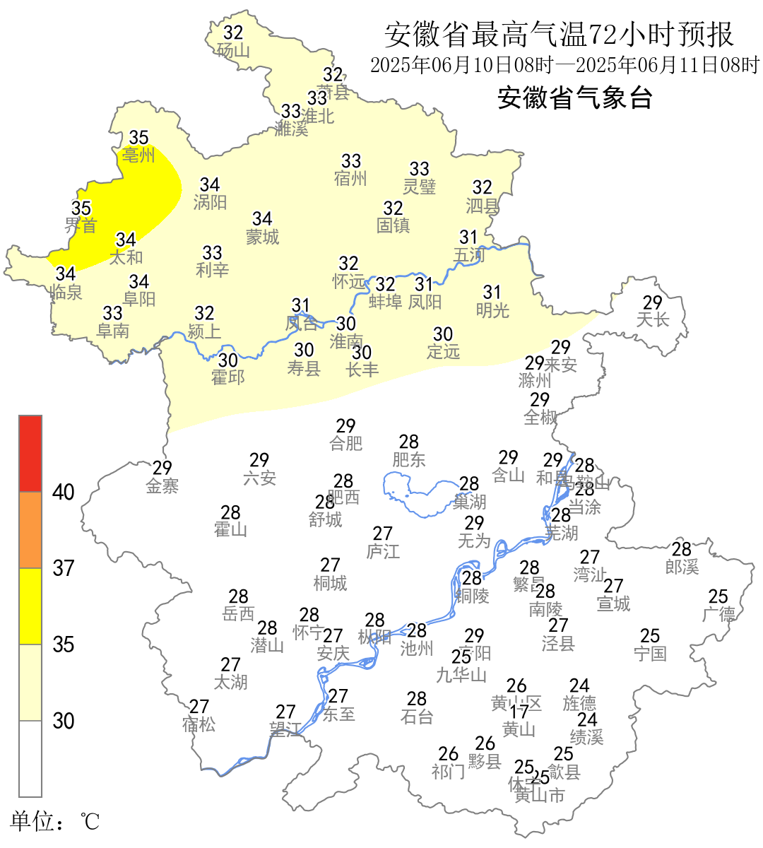 预报未来十天淮北部分地区有持续性高温天气(8-9日北部,10-13日西部,14-17日全部),最高气温35~38℃,其中14-15和17日局部可达39~40℃。淮河以南最高气温:8-12日普遍在30℃以下,13-17日为31~34℃。