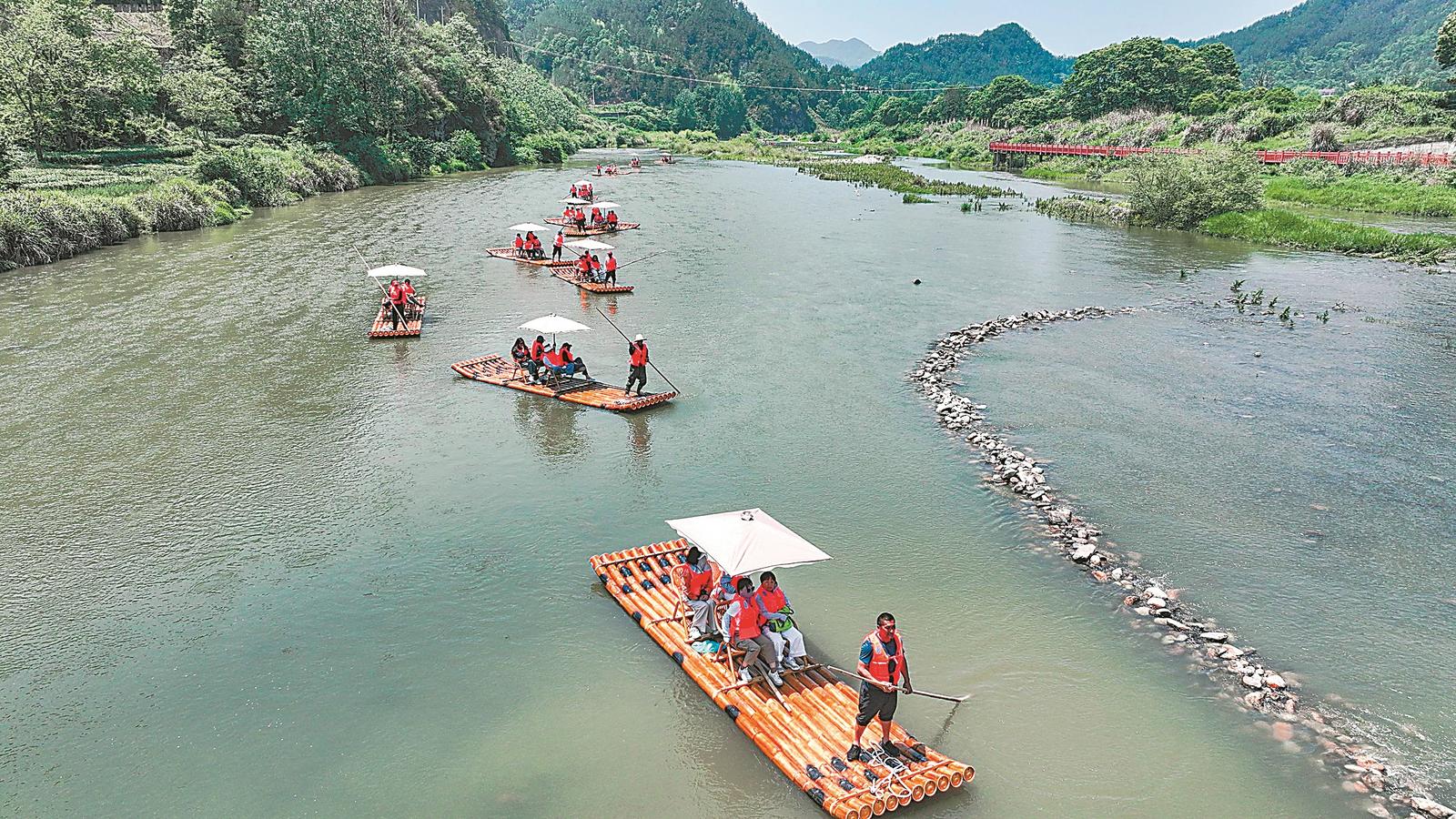 日前,游客在岳西县菖蒲镇境内的天仙河景区体验竹筏漂流的乐趣。本报通讯员 王先国 摄