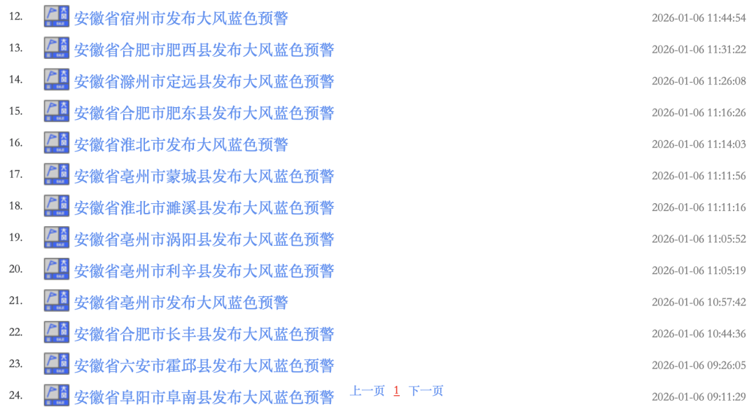 宿州市气象台2026年01月06日11时43分发布大风蓝色预警信号。受冷空气影响,24小时内我市宿城主城区和埇桥区曹村、顺河、朱仙庄、大营等大部分乡镇(街道)以及砀山县、萧县、灵璧县、泗县等地部分乡镇(街道)平均风力可达4~5级,阵风7~8级,请注意防范。